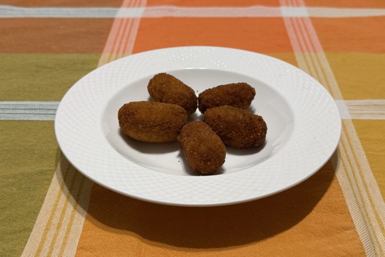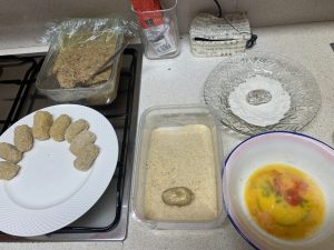 Preparamos 3 platos para el rebozado: uno de harina, uno con los huevos batidos y otro con el pan rallado. Hacemos las croquetas y las pasamos por harina, huevo y pan rallado (en este orden).