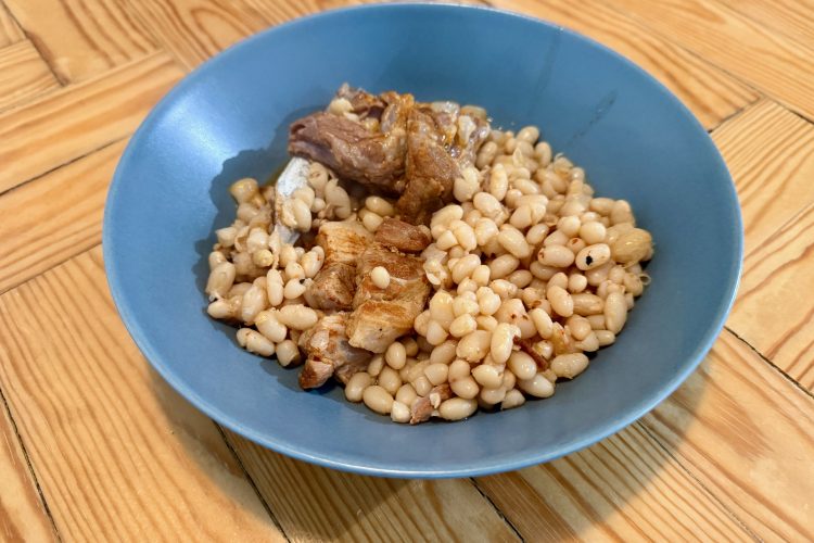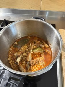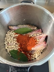• En la olla exprés añadimos un poco de aceite de oliva y doramos las costillas y la panceta. Cuando la carne esté dorada, agregamos las judías, cubrimos con el caldo de verduras o agua, y añadimos el laurel, pimenta, un poco de sal y el pimentón.