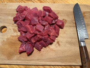 - Cortar la carne en trozo no muy grandes y retirar los tendones y partes más duras.