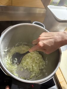 - Cortar las cebollas en trozos no muy grandes, picar el ajo y los pimientos. Sofreir la cebolla y el ajo durante 10 minutos. Agregar el pimentón dulce y picante con cuidado para que no se queme.