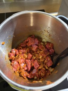 - Agregar el resto de ingredientes (la carne, caldo, tomate concentrado, tomate triturado, pimiento, laurel y patatas (opcional)). Hervir durante 2-3 horas o hasta que la carne esté suave. En olla rápida hervir a presión alta durante 45 minutos.