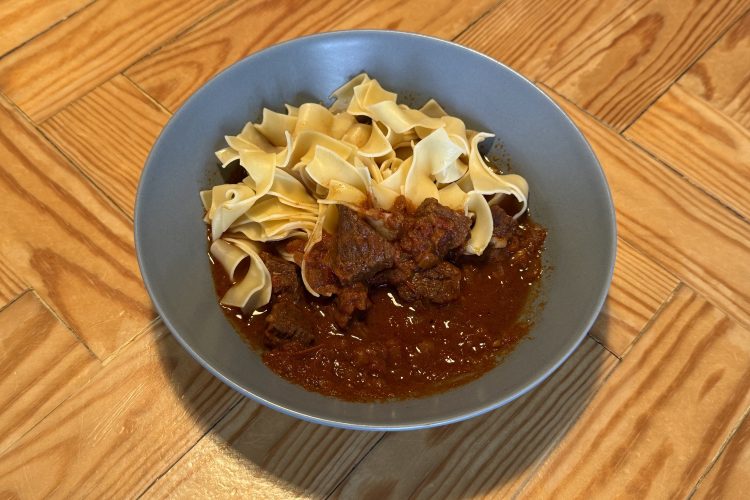 - Se puede servir con pasta corta tipo tallarines con huevo o con Spätzle.